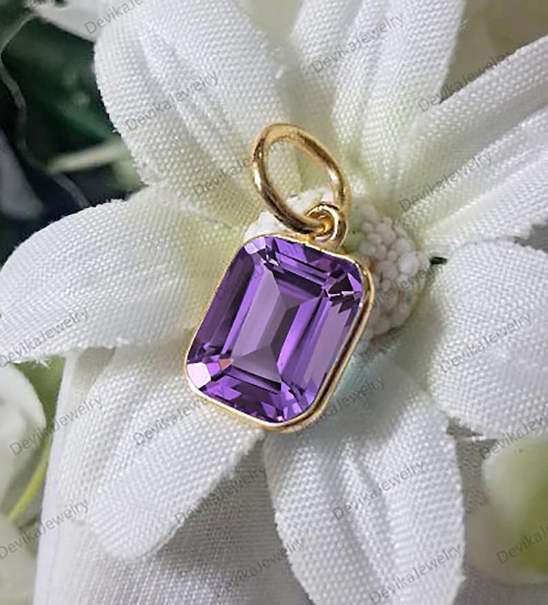 This handmade 14K gold amethyst solitaire pendant features a stunning emerald-cut design that highlights the rich purple beauty of natural amethyst. Crafted with precision and elegance, this charm pendant delivers a refined, luxurious look while keeping the design minimal and timeless.